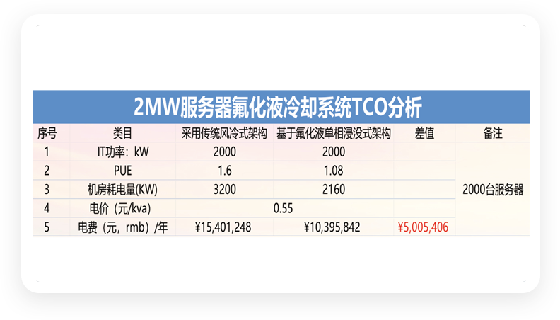 一個采用浸沒式液冷架構的2MW規模的大型數據中心,相較于采用傳統風冷模式搭建的系統每年減少用電1000萬度節省電費五百萬左右。